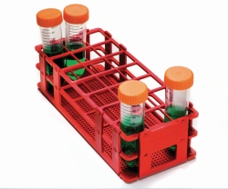 Die Reagenzglasgestelle sinken im Wasserbad und haben nummerierte und beschriftete Reihen zur Identifizierung der Röhrchen. Abmessungen (B x T x H): 246 x 104 x 64 mm.