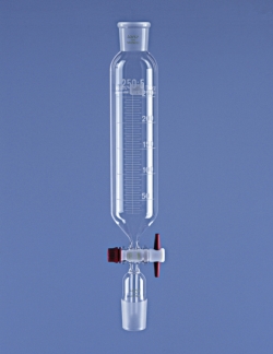 Zylindrische Form. Mit NS-Hülse, NS-Kern und Hahnküken mit Gewindesicherung. Mit Teilung zum Ablesen des ungefähren Volumens. | |