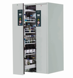 Die platzsparenden Sicherheitsschränke mit Vertikalauszug sorgen für optimale Übersicht und beidseitigen Zugriff auf alle eingelagerten Gebinde. Sichere und vorschriftsmäßige Lagerung entzündbarer Gefahrstoffe in Arbeitsräumen.